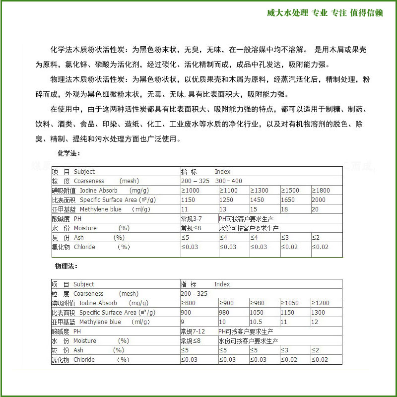 踏踏實實,弘揚匠人精神!兢兢業(yè)業(yè),塑造民族品牌!感謝您關(guān)注威大水處理官網(wǎng)木質(zhì)粉狀活性炭產(chǎn)品信息,也歡迎您提出寶貴的意見,共同推進(jìn)中國制造的國際競爭力!對威大木質(zhì)粉狀活性炭若有疑問的地方,請撥打威大技術(shù)工程師電話: